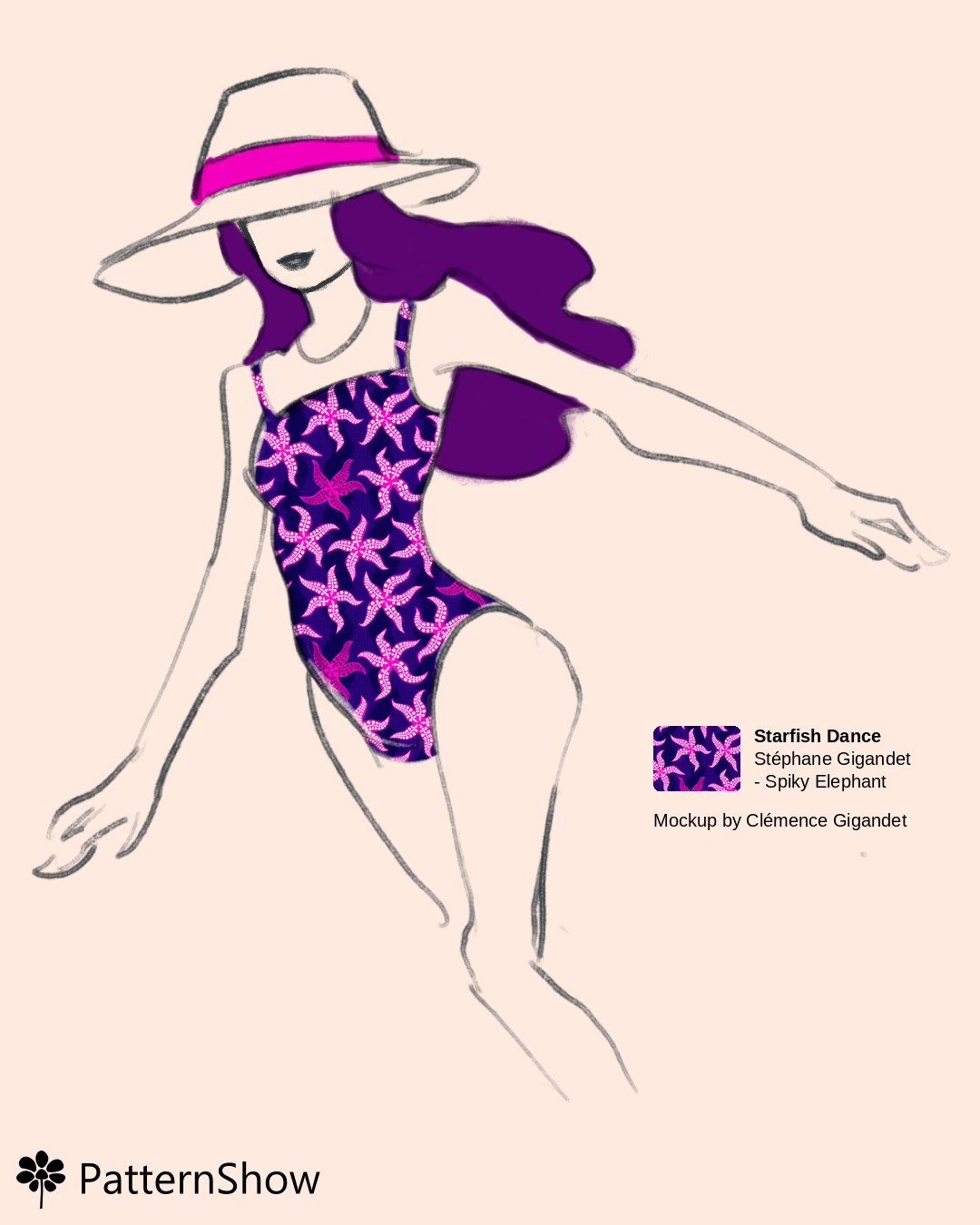 Woman in Swimsuit and Hat with Deep violet, Shocking pink, White