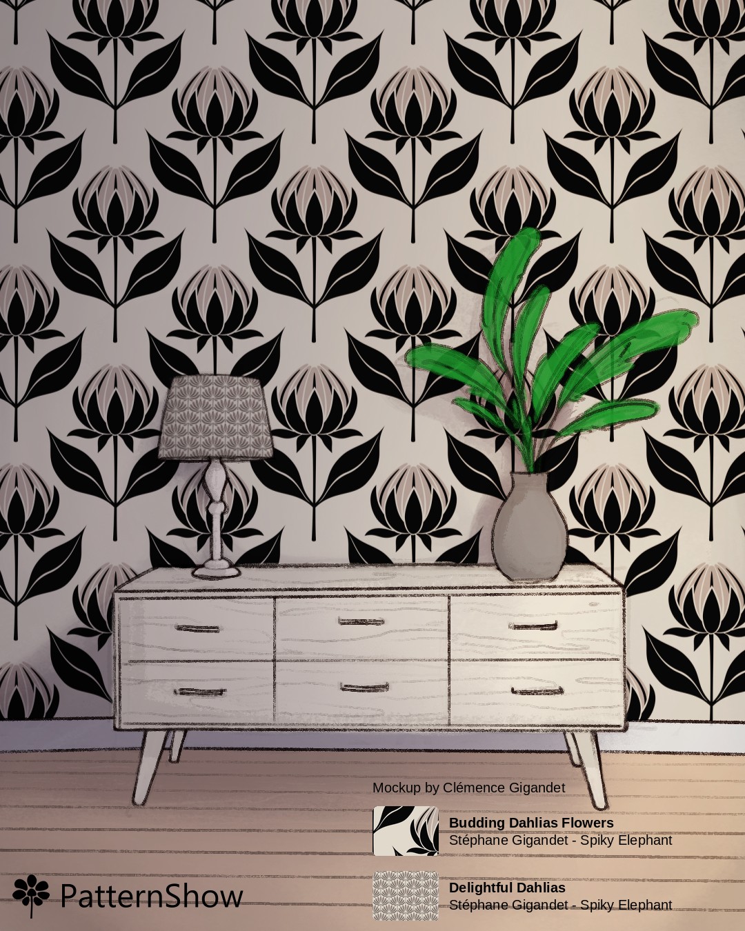 Black and Beige Block Print Budding Dahlias Room
