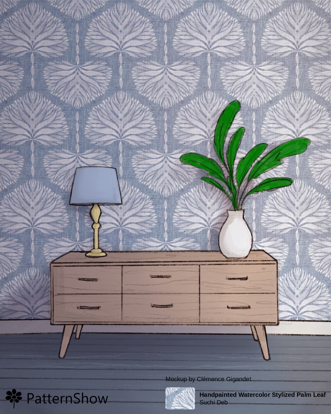 Living Room with Dresser, Plant and Lamp with Lavender gray, Pewter Blue, Anti-flash white