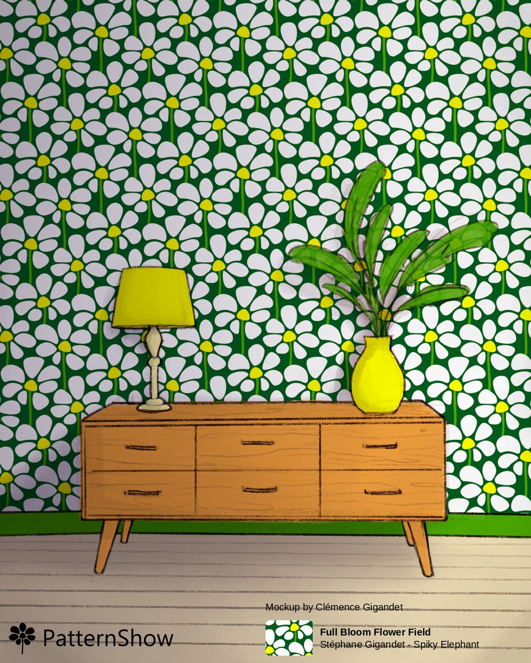 Living Room with Dresser, Plant and Lamp with White, Dark green, Canary yellow