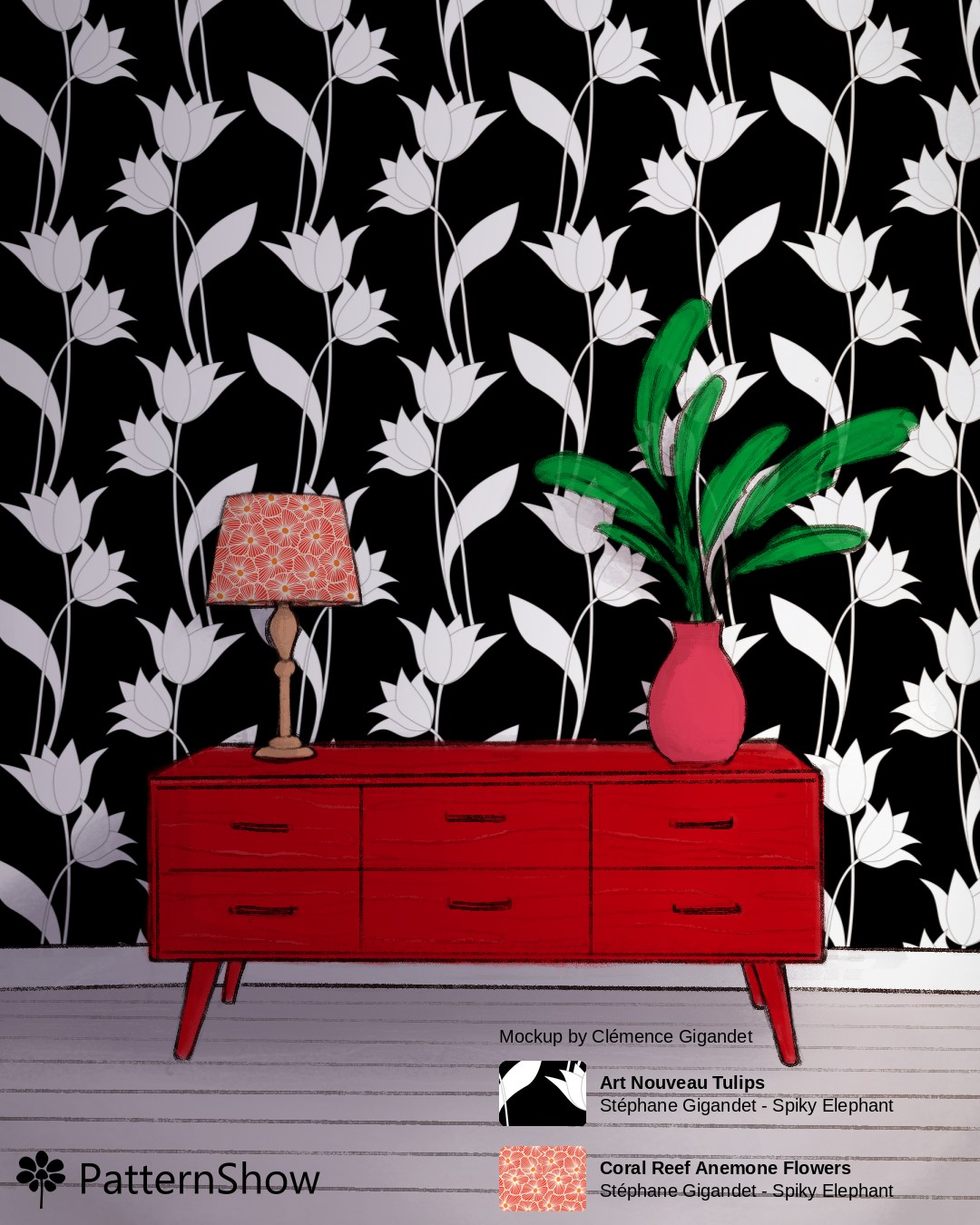 White on Black Tulips Wallpaper and Red Lacquered Chest of Drawers