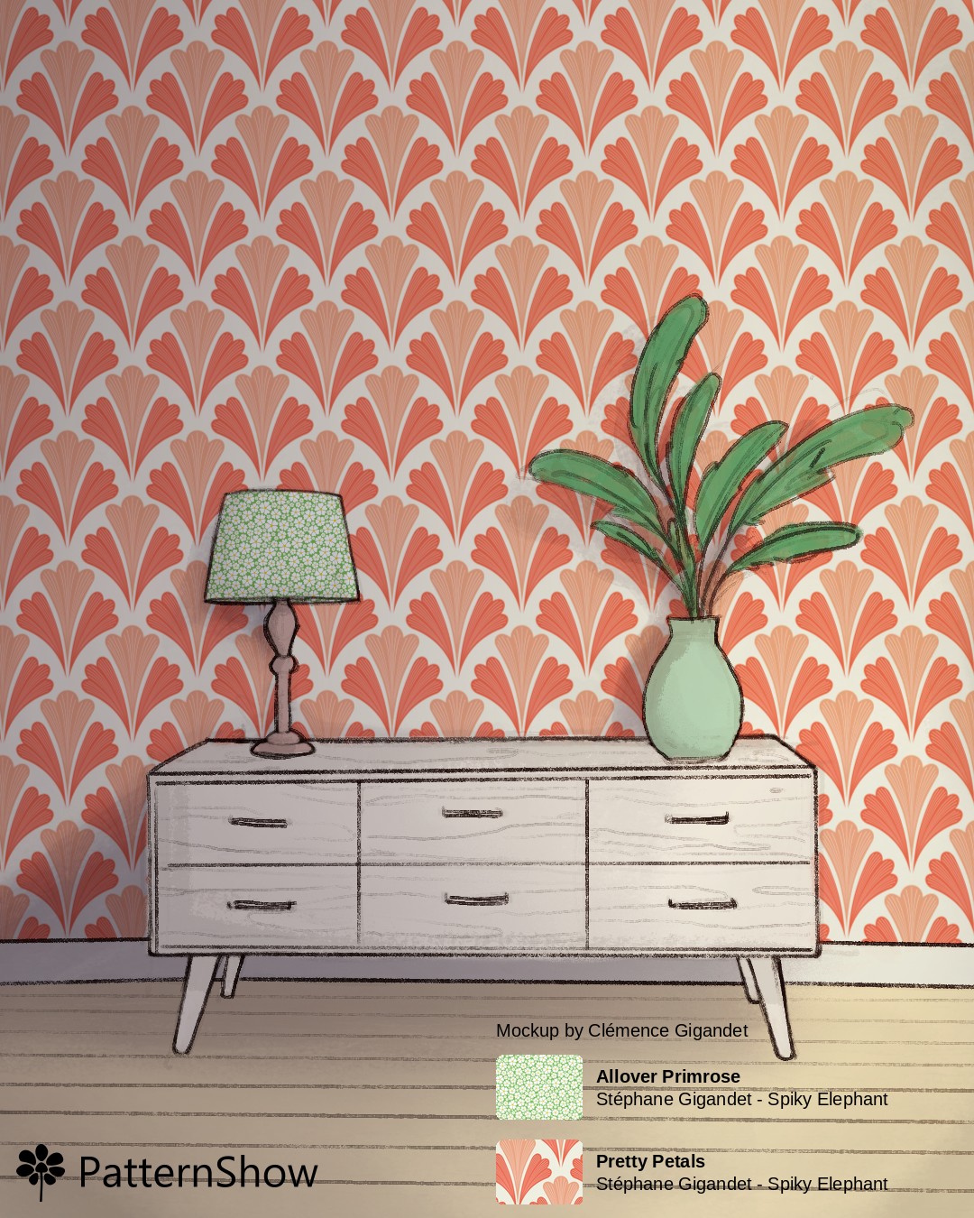 Living Room with Dresser, Plant and Lamp with Alabaster, Carmine pink, Dark salmon